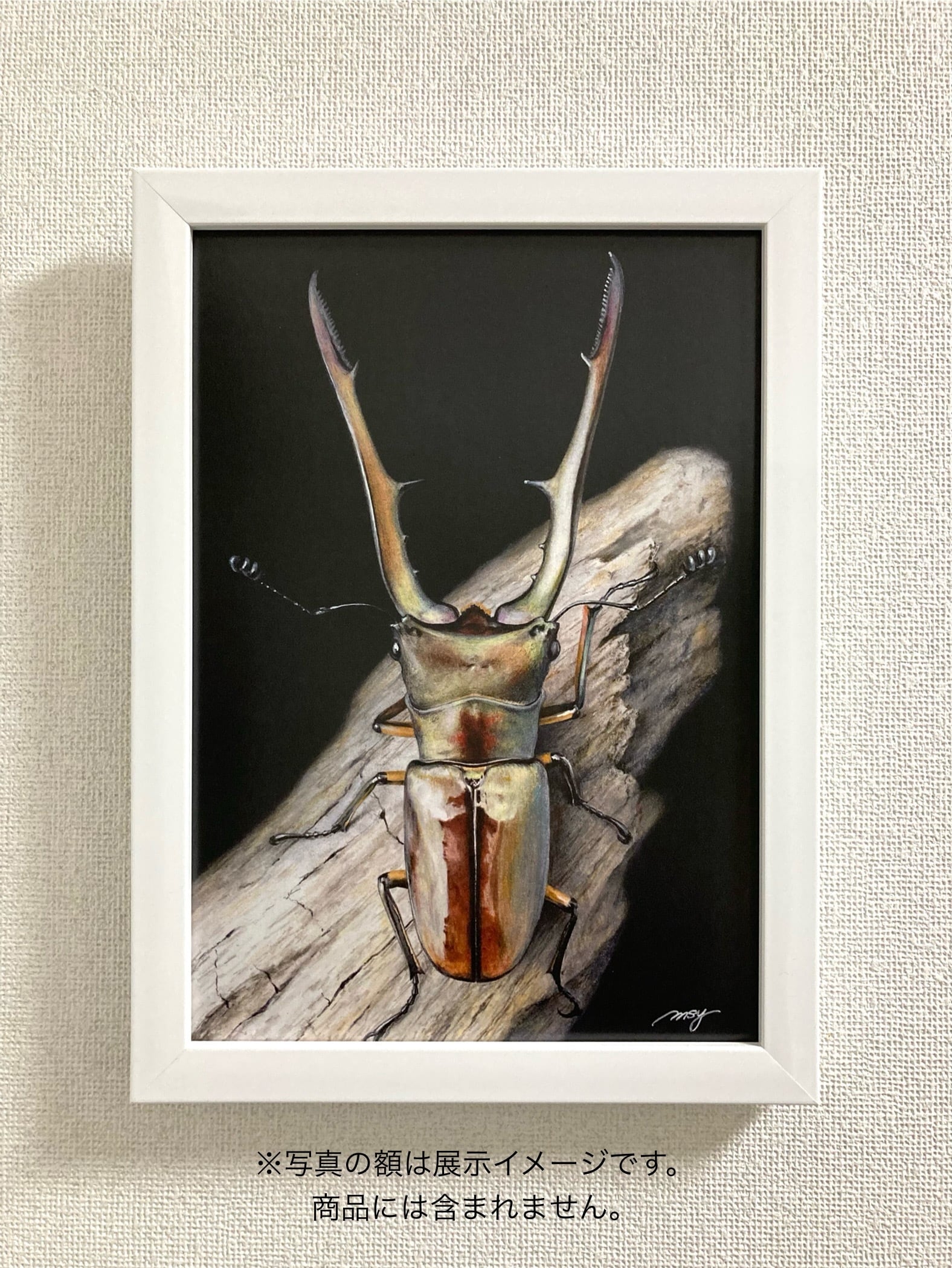 「メタリフェル ホソアカクワガタ 亜種サンギレンシス」を描いた色鉛筆画のプリントです。