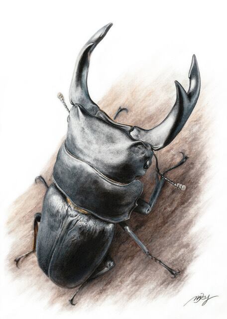 カブトムシ、クワガタを主に昆虫のイラストを色鉛筆で描いています。