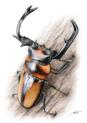 カブトムシ、クワガタを主に昆虫のイラストを色鉛筆で描いています。