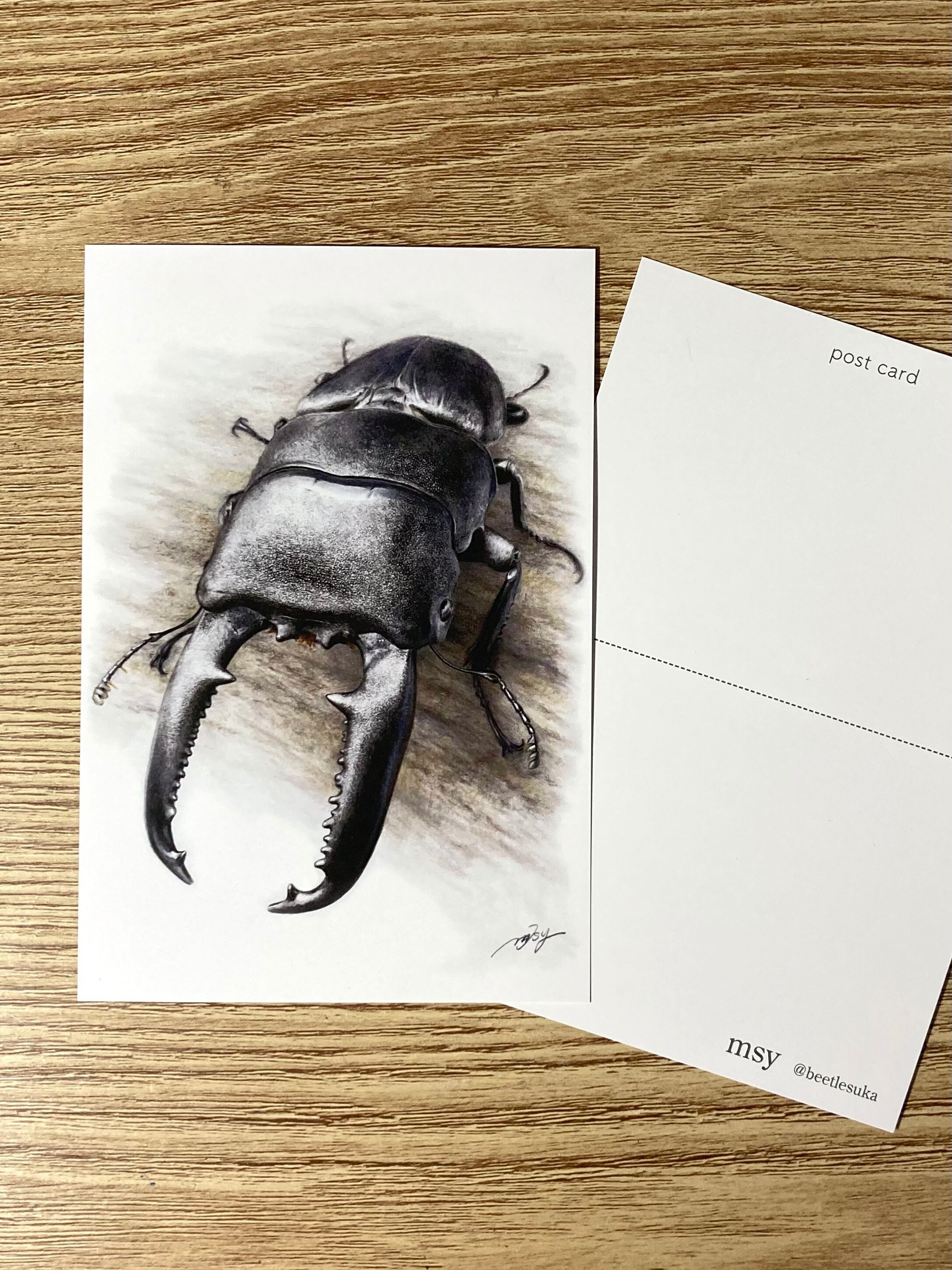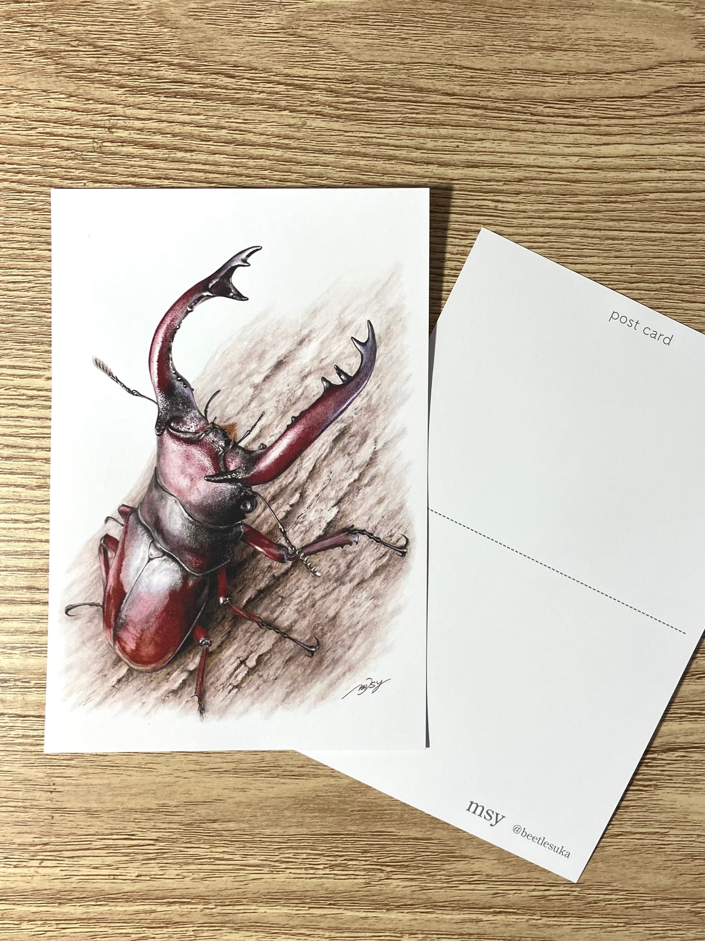 クワガタ、カブトムシを描いた色鉛筆画のポストカード(プリント)です。